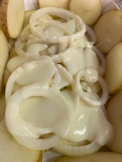 My second recommendation or critique would be to add more layers of the potatoes and onion in the casserole dish. All Recipes suggests 2 layers – but I fit about 5!
