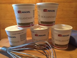 - in a separate bowl add about one table spoon of boiling water. add the separated hollandaise to the hot water. use your balloon whisk to beat until it is back. Continue adding the separated hollandaise. once together add the butter that was pulled.