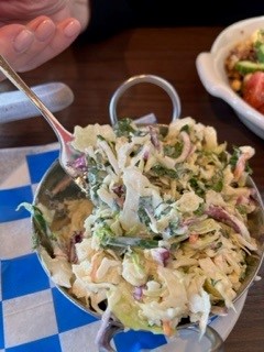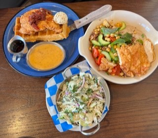 really good Cole slaw Loved the inverted Tree. Festive Luminaires Salad with Chix fun interior Fried Chicken and waffle w Gravy. Spot on.