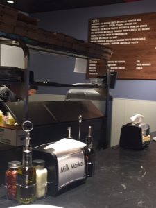 The pies are 12 inch thin crust and this one is perfectly cooked. the pizza has good base sauce, perfect amount of mozzarella and peperoni in every slice. architectural aesthetics for food kiosk and feels a niche carved out of the hall for the vendor. Retro music in the back ground is pleasant white noise – and is not to loud to block out conversation. My 3 dining criteria include: architectural aesthetics, background noise, and the food on the plate.
