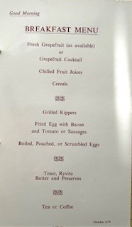 Another table d’hôtel menu could be called breakfast. for example choice of fruit segments, grapefruit of orange or fruit juices followed by cereal and the sausage, egg, bacon, tomato then followed by a drink.