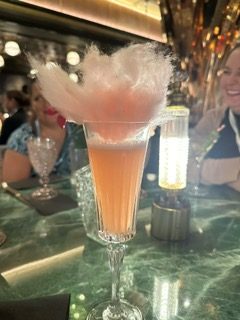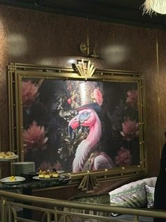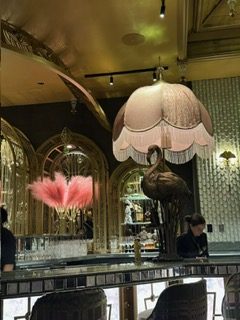Ordained in flamingo motifs, the room is dazzling of blush-pink glamor and gilded whimsy. All perfectly in step with the glitzy, feathered cocktails that arrive as center pieces in glassware.