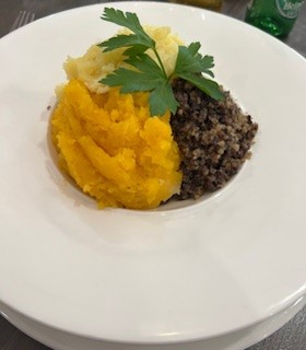 As the haggis came to the table – the only thing missing from the presentation is a piper playing the bagpipes. The Haggis comes table side is steaming and fragrant, rich and earthy. Haggis blend of minced meats, oats and spices wrapped in tradition as much as flavor. Served with “neeps and tatties” (turnips and potato) it is a rustic and satisfying dish that speaks to Scotland’s resilience and pride.